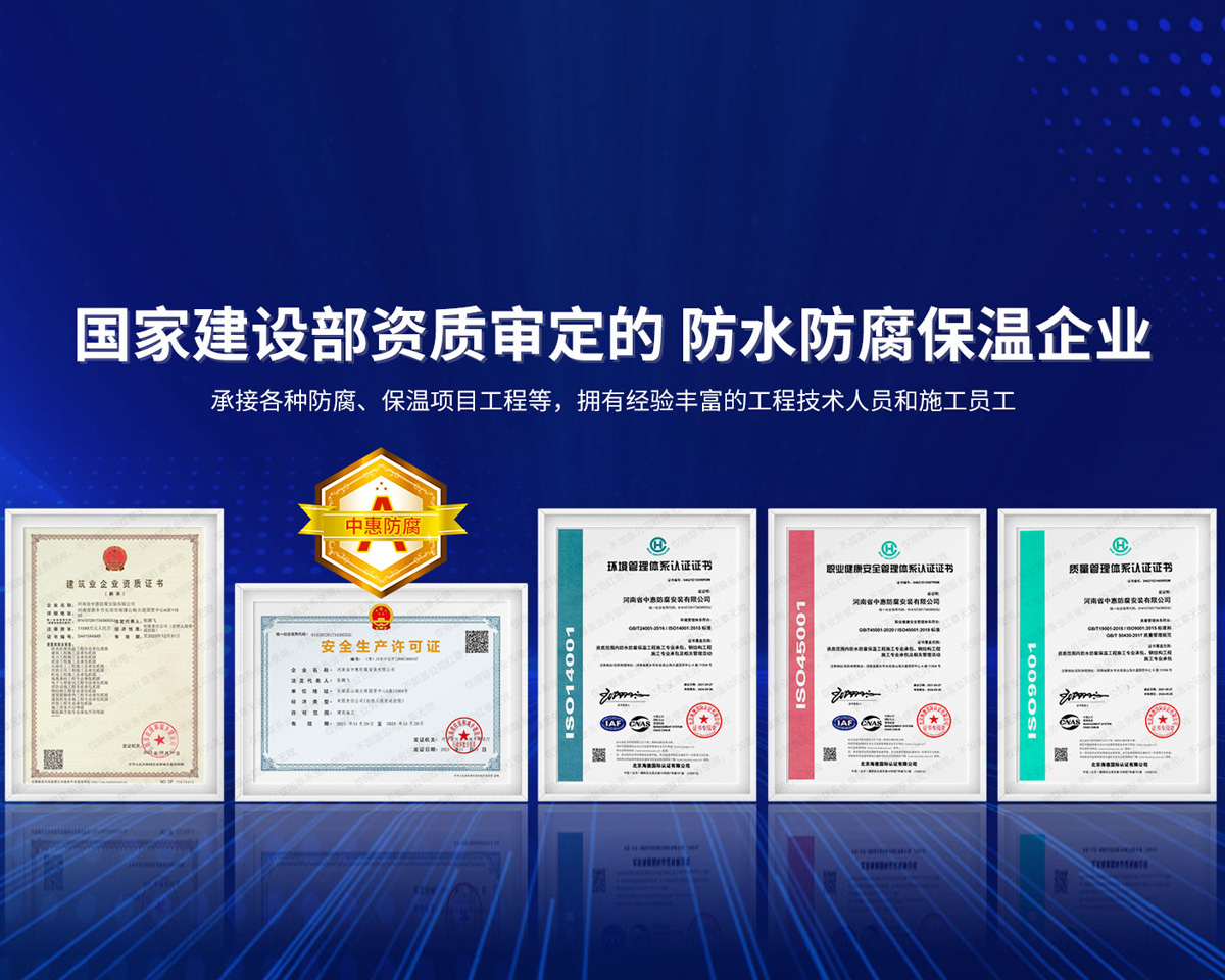 公司經營范圍:防水防腐保溫工程;消防設施工程;建筑裝修裝飾工程;建筑機電安裝工程;電力工程;建筑工程;石油化工工程;工業(yè)清洗工程;油罐清洗工程;鋼結構工程;環(huán)保工程;模板腳手架工程;電纜防火封堵、防污閃噴涂、外墻外保溫工程;各類施工勞務作業(yè);設備維修、船舶鉚焊、涂裝;電力工程材料、建材、防水材料、防火材料、防腐保溫材料銷售,并相繼通過了GB/T19001-2008idtISO9001:2008GB/T50430-2007質量管理體系認證證書。GB/T24001-2004idtISO14001:2004環(huán)境管理體系認證證書。GB/T28001-2011idtOHSAS18001:2007職業(yè)健康安全管理體系認證證書。公司是中國防腐蝕于防護協(xié)會、中國施工企業(yè)管理協(xié)會、電力協(xié)會和中國鋼結構防水協(xié)會會員單位。 公司的經營業(yè)務涵蓋了石油、化工、電力、冶金、煤炭、船舶、國防、燃氣、水利、環(huán)保、交通運輸、航空及國防軍工和輕紡市政等行業(yè)的防腐保溫絕熱設備。鋼結構安裝、防火、防水、金屬噴鍍、聚脲噴繪、陰極保護、防滲透堵漏、玻璃鋼及各種磚版材料襯里、橡膠襯里、煙氣硫和耐酸溶劑腐蝕等工程施工。公司連續(xù)十年榮獲“省市先進施工企業(yè)”“安全生產先進單位”“重合同,守信用企業(yè)”和“AA***資質企業(yè)”的稱號。2000年被命名為市級文明單位,2002年被國家工商行政管理局命名為“重合同,守信用的企業(yè)”、被中國工業(yè)防腐蝕技術協(xié)會命名為“防腐蝕企業(yè),能源節(jié)約及環(huán)境保護領域有豐富的經驗和***的業(yè)績。工程一次交驗合格率100%。其中攀枝花鋼鐵公司煉鐵廠四號高爐及熱風爐防腐工程、上海寶鋼公司煤氣柜防腐工程、撫順石油一廠裝置防腐項目、齊魯石化公司稀烴廠高塔防腐工程、吉林化學工業(yè)公司煉油廠油罐防腐工程、天津石化熱電廠六號爐頂棚聯(lián)絡管保溫工程、大慶油田(太倉)力神泵業(yè)工程、中國化學工程第十一建設工程、中原油田勘探局工程、中國石化銷售有限公司華北分部、魯皖輸油管道工程、貴州開磷息烽合成氨工程、陜西黃陵煤化工程、中國石油天然氣西部管道塔里木輸油工程、邯鋼集團邯寶鋼鐵公司煉鐵工程、德州供電工程、吉寶(南通)船廠工程,偃師華潤熱力工程、鄭州熱力總公司。 河南省中惠防腐安裝有限公司愿以豐富的施工經驗,***的技術,***的設備,***的管理,***的服務,竭誠為國內外廣大的用戶提供***滿意、******的工程作品。 我公司愿與國內外同仁一道,團結協(xié)作,共同推進防腐蝕行業(yè)發(fā)展! 公司地址:河南省長垣縣建設路北段360號 固定電話:0373-8866488 郵編:453400 網(wǎng)址:http://www_zhff_com_cn.lnvvsun.com